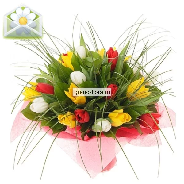 Нежные и изящные тюльпаны – это легкое свежее дыхание весны, которое напомнит вам о том, что вся природа пробуждается, чтобы радовать своими буйными красками ваших любимых. Международная служба доставки цветов grand-flora.ru подготовила для вас достойный подарок – оригинальную яркую композицию из разноцветных тюльпанов и сочной зелени «Сюзанна».