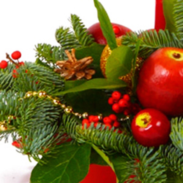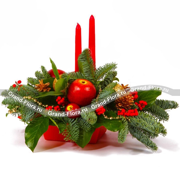 Новогодняя флористическая композиция с использованием декора в виде красных яблоков. Такая композиция согреет теплом в новогоднюю ночь