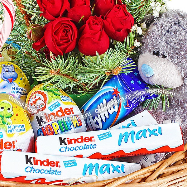 ЛЮКС: роза красная кустовая - 3 шт., гипсофила - 3 шт., еловая ветвь, Мишка Teddy - 20 см, рождественские конфетки - 7 шт., Kinder Сюрприз - 6 шт., Kinder Chocolat max - 6 шт., MilkaWay - 1 шт., оазис, корзина большая.