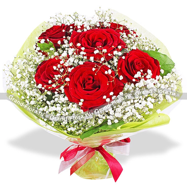 Стандартный: роза красная - 7 шт., гипсофила - 4 шт., рускус - 3 шт., фетр зеленый, бант красный.