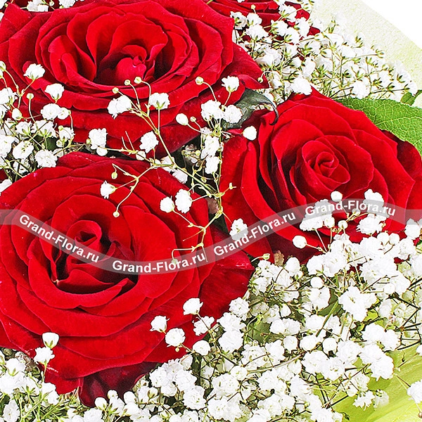 ДЕЛЮКС: роза красная - 15 шт., гипсофила - 6 шт., рускус - 5 шт., фетр зеленый, бант красный.