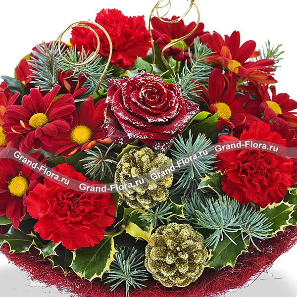Уменьшенный: Роза красная - 1 шт., хризантема кустовая красная - 2 шт.,гвоздика красная - 2 шт., салал - 2 шт., еловая ветвь - 2 шт., шишки декоративные (маленькие)- 2 шт., сизаль красный (упаковка), красная лента.