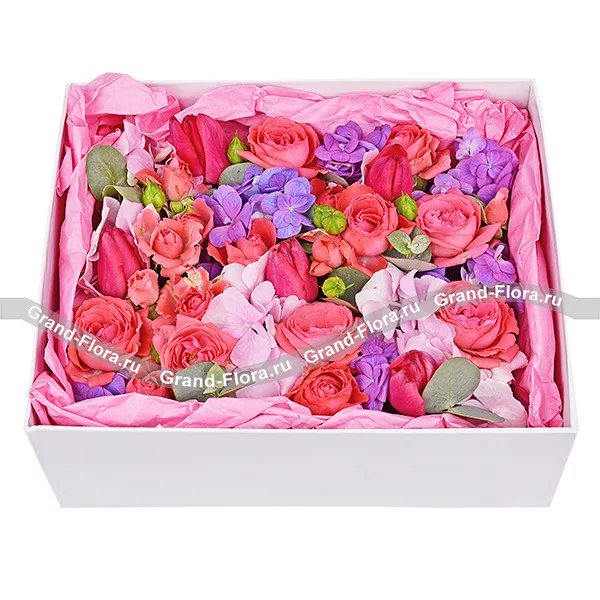 Стандартный: гортензия розовая - 1 шт., гортензия фиолетовая - 1 шт., тюльпан розовый - 4 шт., роза кустовая розовая - 3 шт., эвкалипт, оазис, коробка.